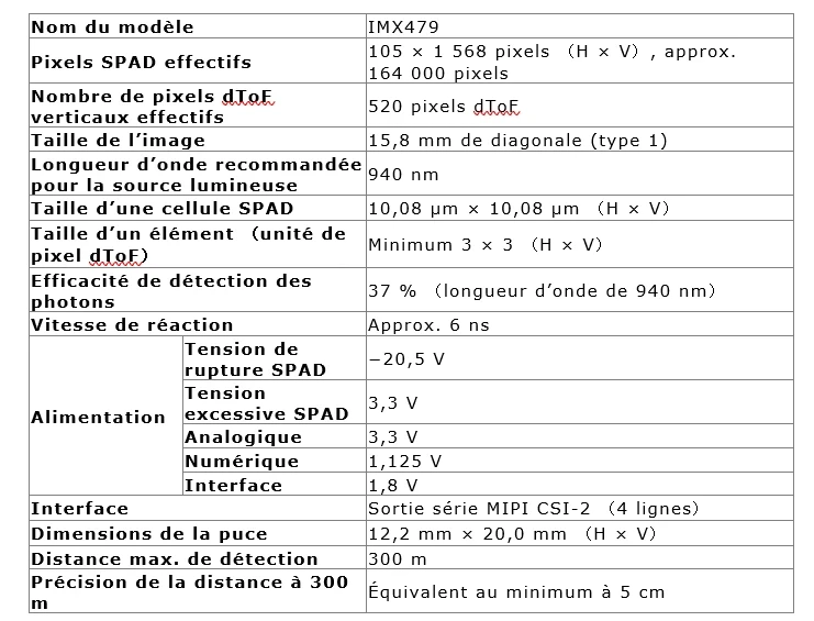 La Sony Semiconductor Solutions Corporation (SSS) annonce la mise sur le marché prochaine du capteur de profondeur SPAD empilé IMX479, élaboré pour rehausser l'exactitude et la célérité des dispositifs LiDAR automobiles. En exploitant la méthode direct Time of Flight (dToF), ce capteur procure des performances sans précédent, indispensables pour les technologies ADAS (systèmes d'assistance à la conduite perfectionnés) et AD (conduite autonome).