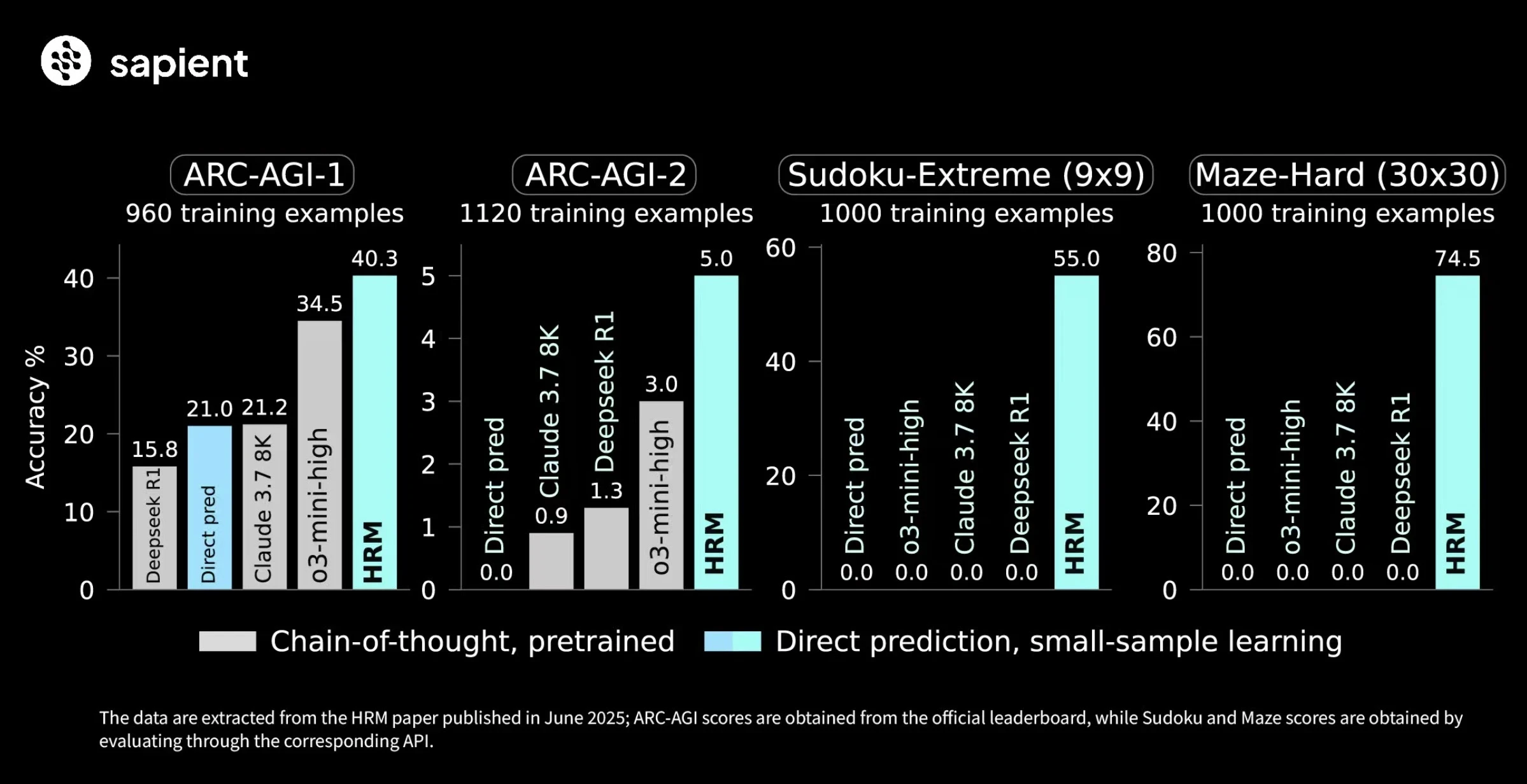 Malgré sa taille modeste, HRM surpasse des modèles comme OpenAI o3-mini, Claude 3.7 8K ou DeepSeek R1 dans des tâches reconnues comme particulièrement difficiles.
