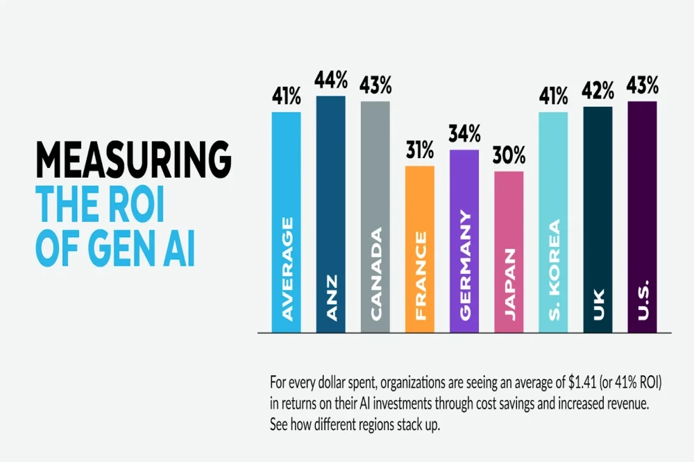 Dans ce contexte mondial favorable, la France affiche un profil plus mesuré. 41 % des entreprises françaises ont lancé des applications, un chiffre légèrement supérieur à la moyenne mondiale (36 %), mais qui reflète une phase encore expérimentale. Le ROI moyen déclaré s'établit à 31 %, et seules 9 % des entreprises prévoient d'allouer plus de 25 % de leur budget technologique à l'IA générative, contre 25 % dans le reste du monde.